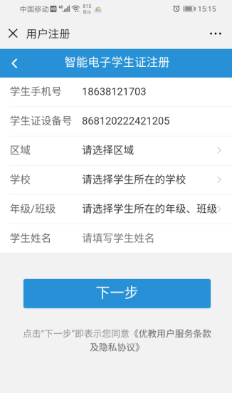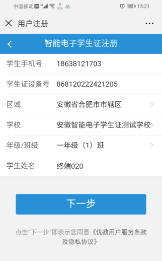 1.进入智能学生证设置->注册绑定界面(图1-1),通过微信“扫一扫”扫描二维码(图1-2),进入用户注册界面后,自动获取学生手机号、设备IMEI号(如图1-3),需要完善区域、学校、年级/班级、学生姓名信息,如图1-4,点击“下一步”