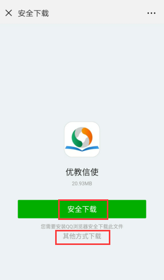 4.进入优教信使APP下载界面如图1-9,可以选择安全下载(需要下载安装QQ浏览器),或者其他方式下载,以下以其他方式下载为例。
