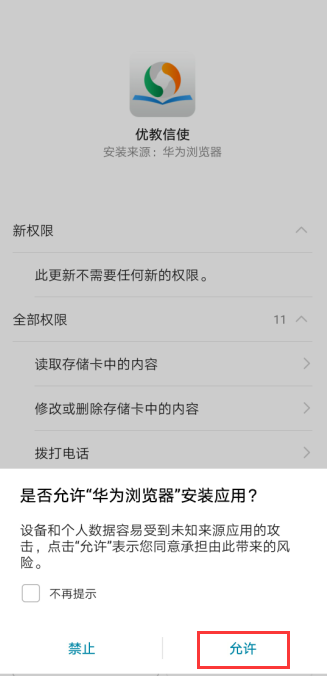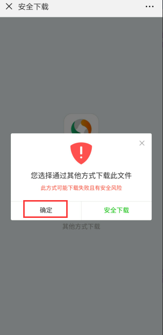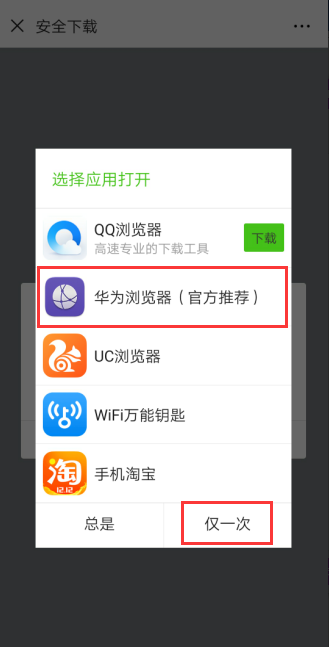 5.点击“其他方式下载”,会弹出安全提示界面,点击“确定”(图1-10),弹出选择浏览器来打开界面,选择对应的浏览器(如华为浏览器),点击仅一次(图1-11)
